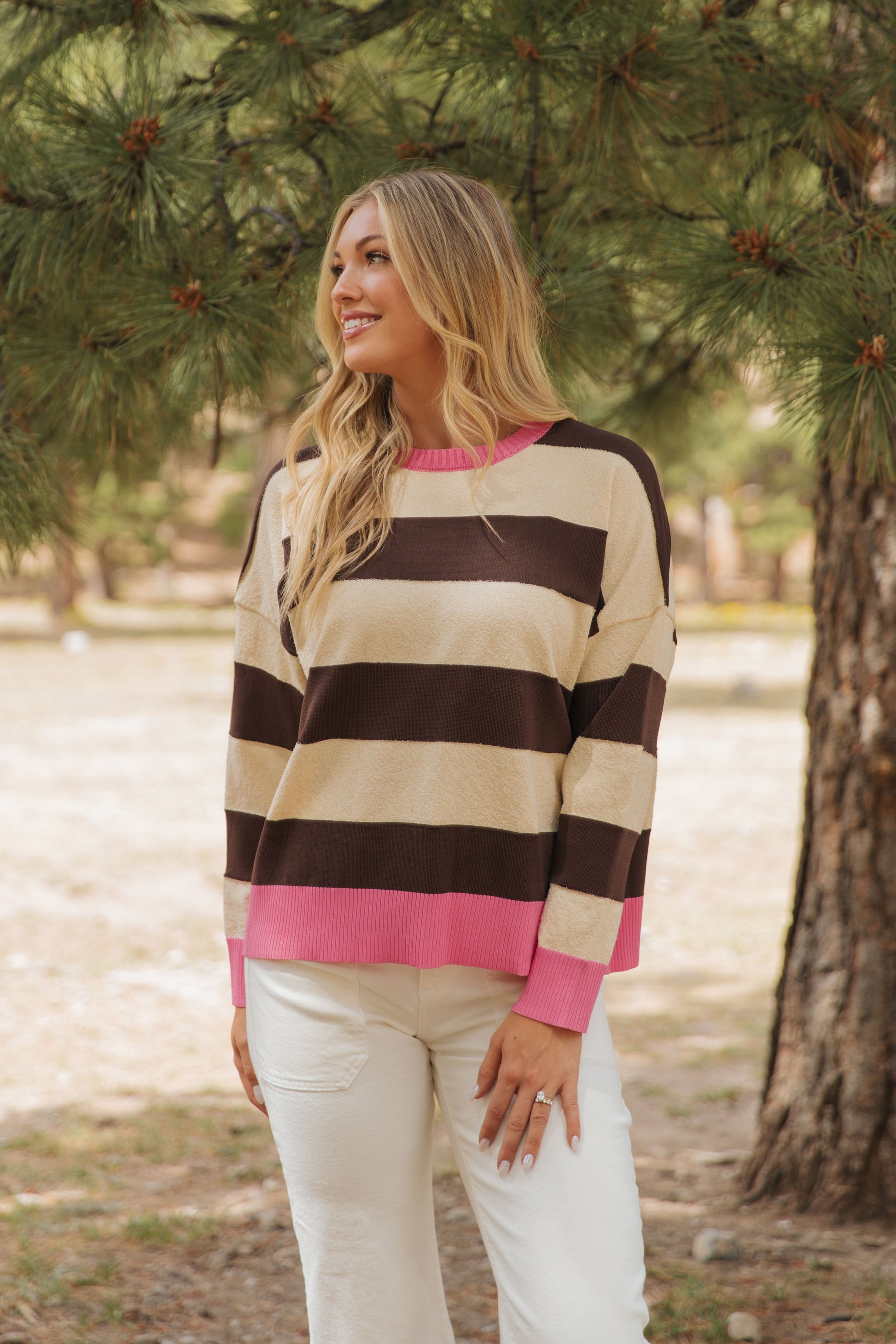 Cozy up in the playful Brenda Color Block Sweater, featuring a warm brown and cream palette with a fun pop of pink trim. This lightweight sweater is perfect for fall days, offering just the right touch of warmth without weighing you down. Add a cheerful splash of color to your autumn wardrobe with this easygoing, stylish favorite.