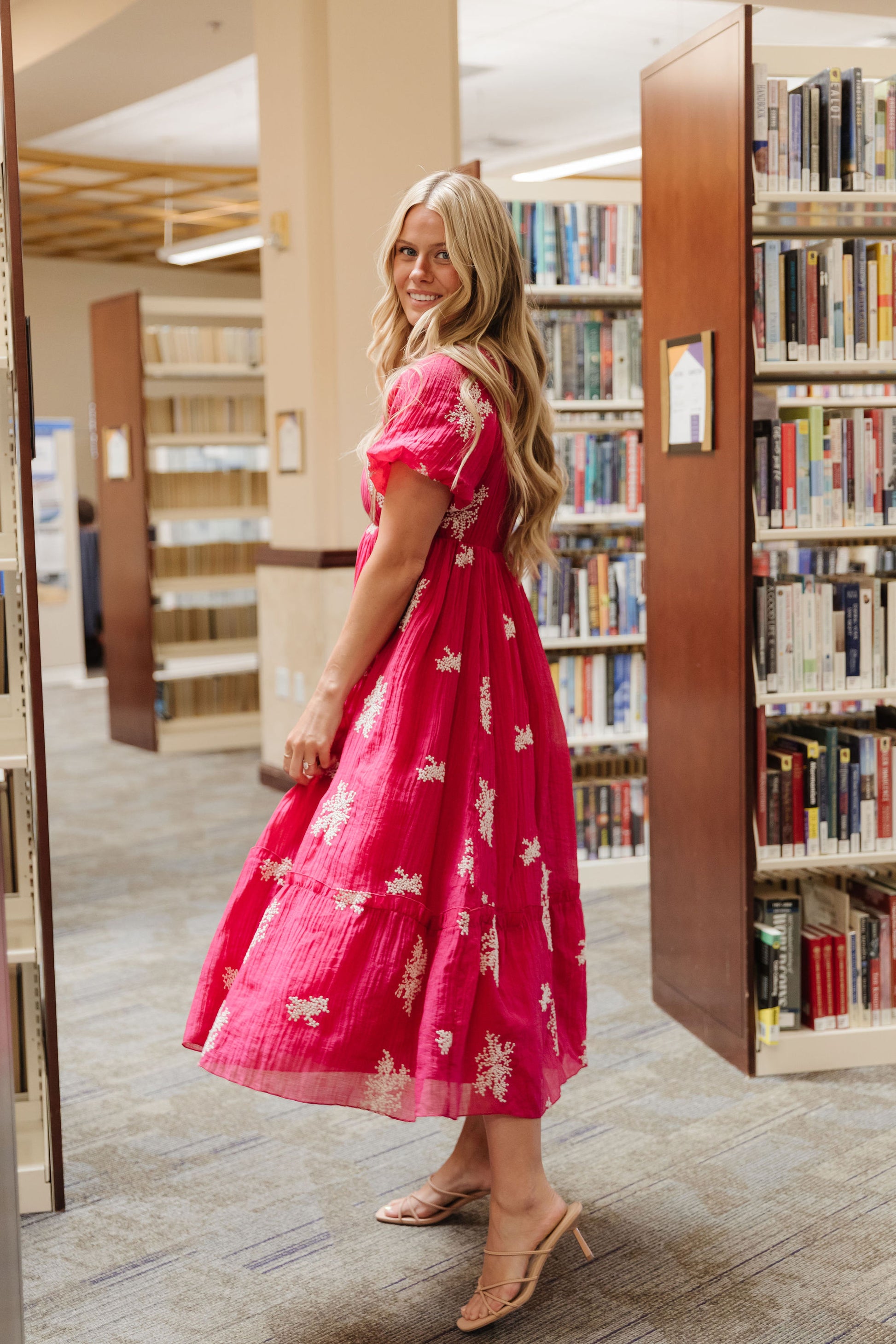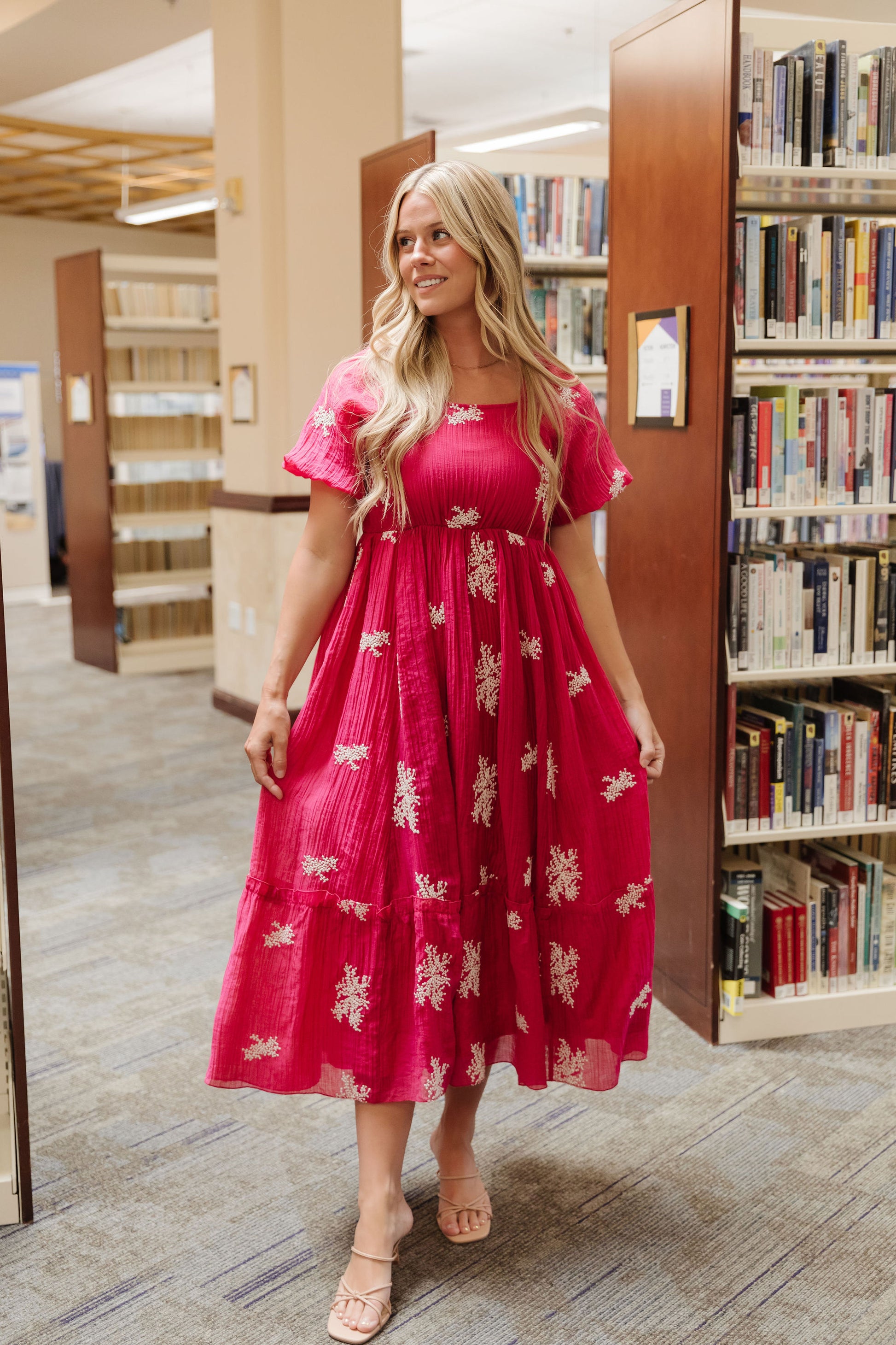 The Camile dress is a chic midi with a touch of whimsy. Its puff sleeves, square neck, and embroidered detailing make it a standout piece. In a rich red hue, it's the perfect blend of playful and elegant.