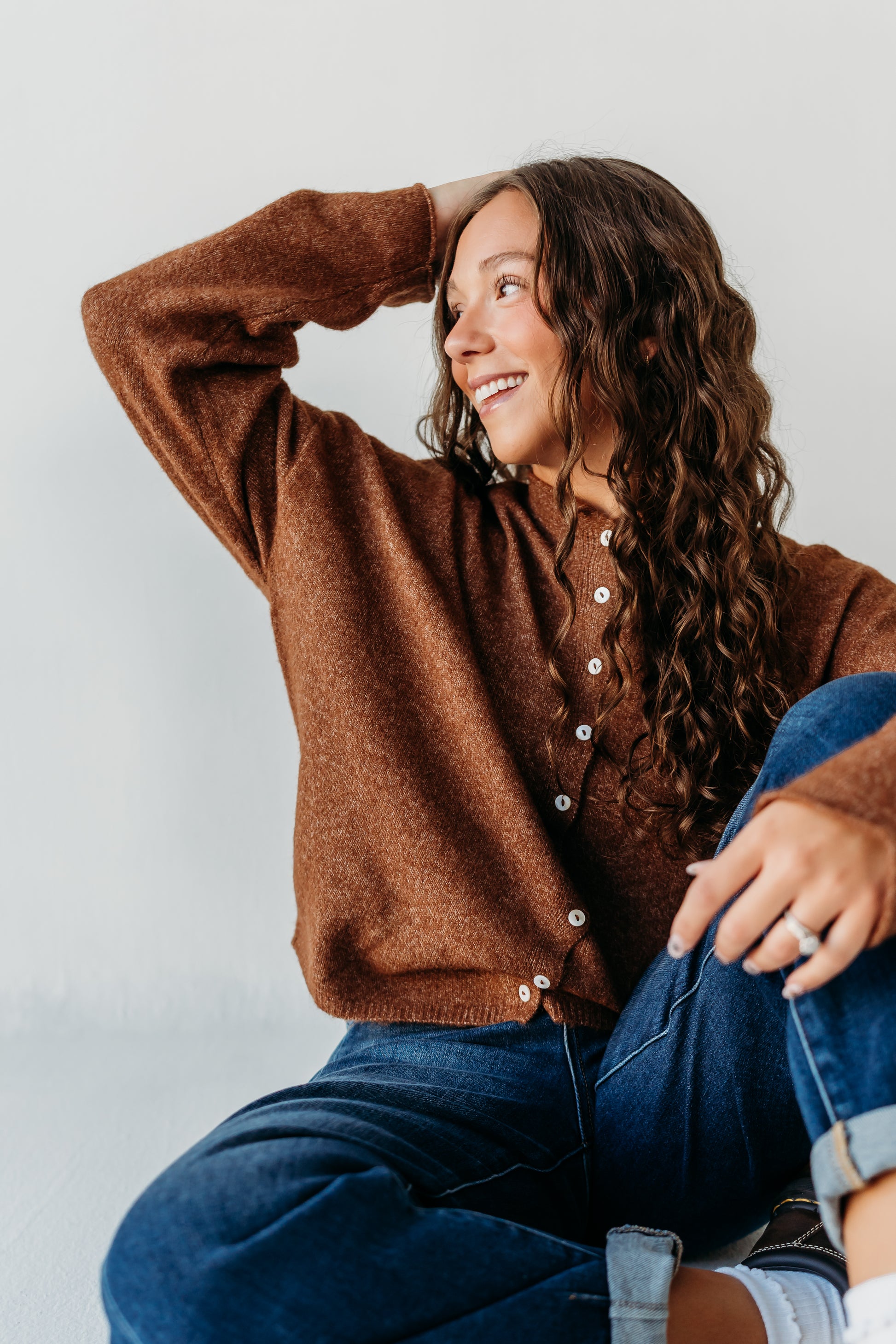Wrap yourself in cozy charm with THE CAMPBELL CARDIGAN IN BROWN. This soft, button-down essential adds a warm touch to your fall wardrobe while keeping things effortlessly stylish. Perfect for layering on crisp autumn days, its rich brown hue complements any outfit with a playful, laid-back vibe.