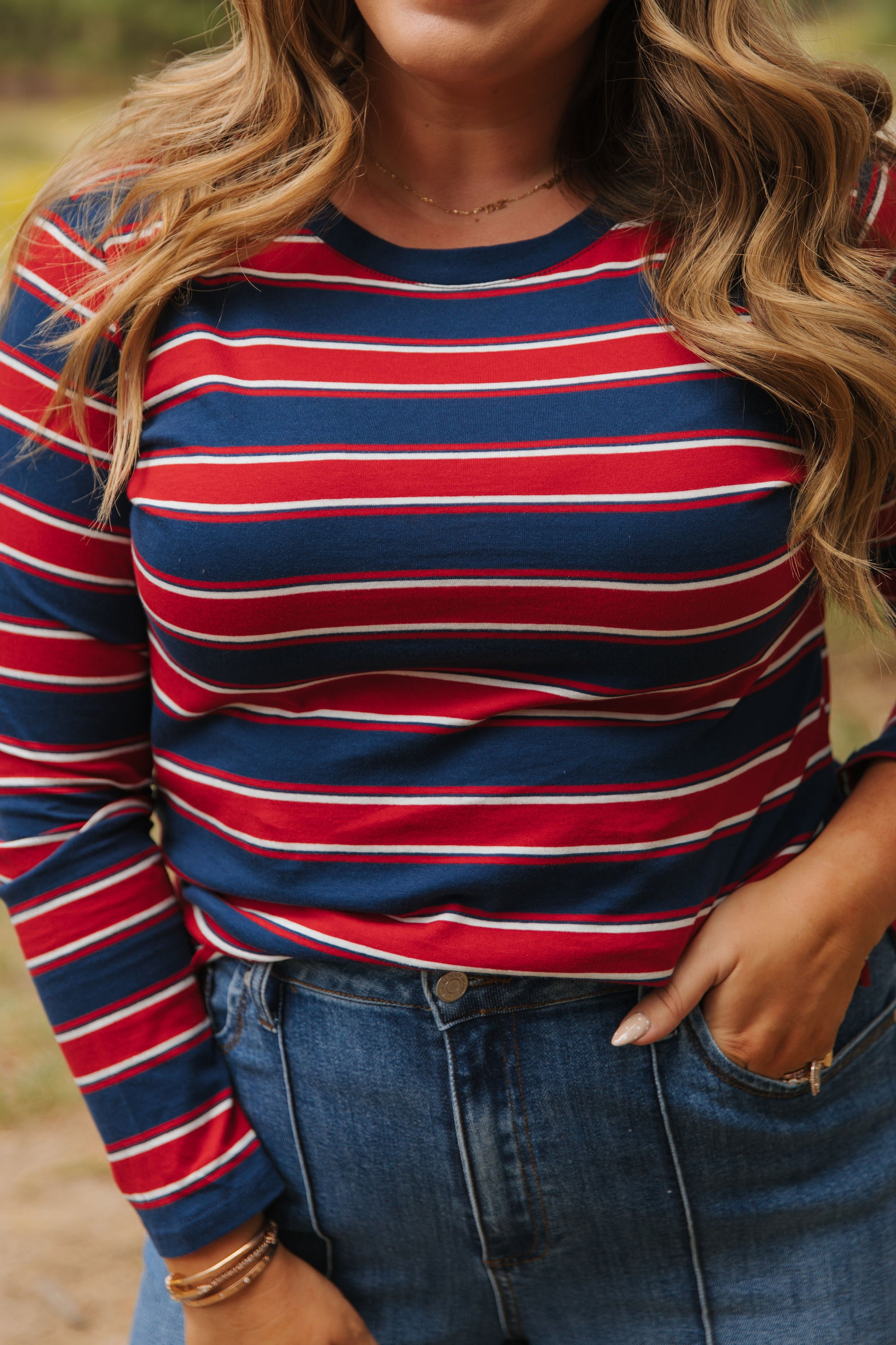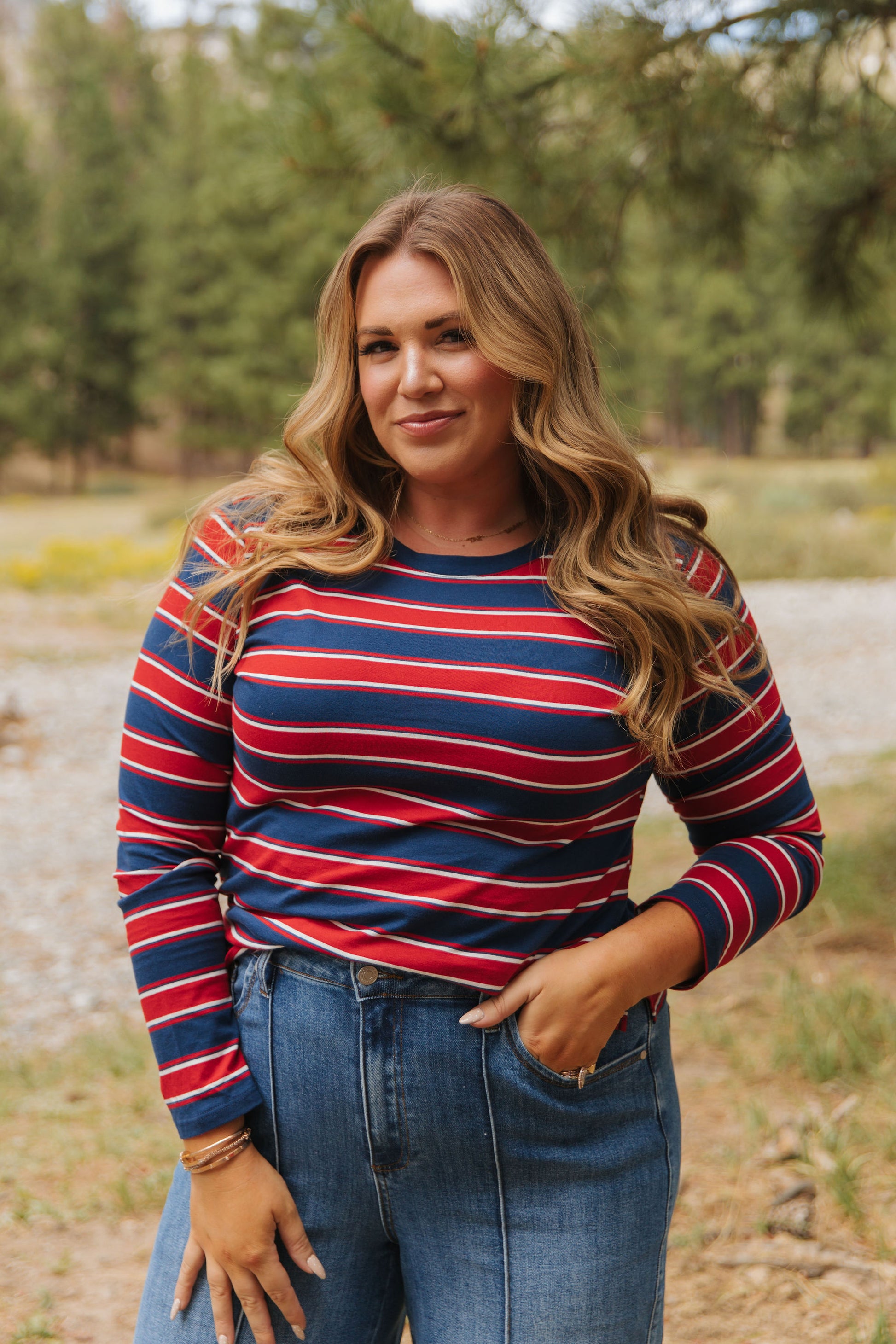 Bring cozy charm to your fall wardrobe with this playful long-sleeve striped top. Crafted from soft cotton, it features a classic crew neck and vibrant navy and red stripes that add a cute, spirited touch to chilly days. Perfect for layering or wearing on its own, this flattering shirt keeps you comfy while adding a splash of fun to your seasonal style.