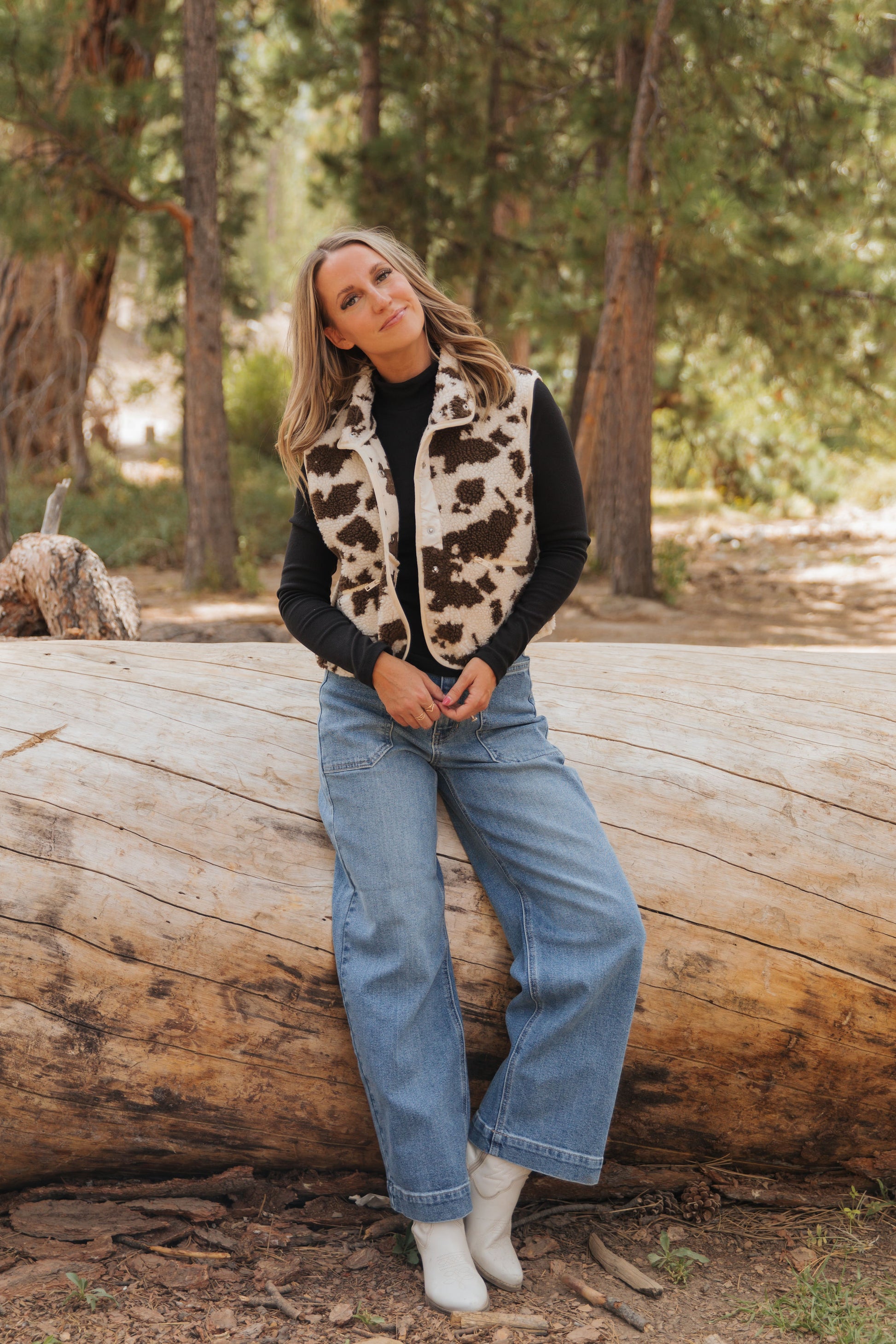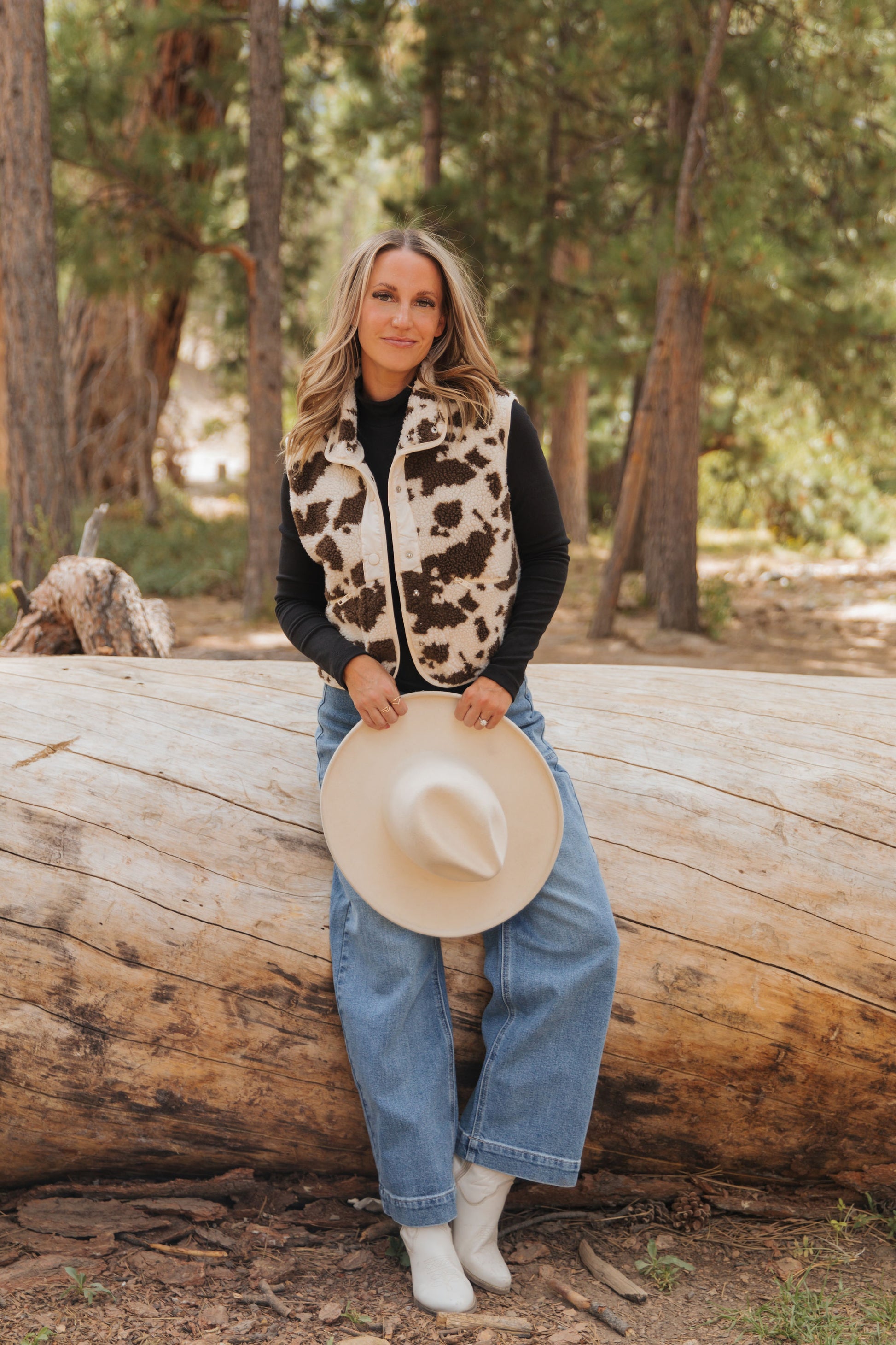 Add a touch of fun to your wardrobe with the Cricket Cow Print Vest in Cream. Featuring a playful brown and cream cow pattern with cozy cream trim, this vest is perfect for layering on chilly days. Its quirky design brings a cheerful twist to any outfit, making it a standout piece for casual adventures and relaxed weekends.