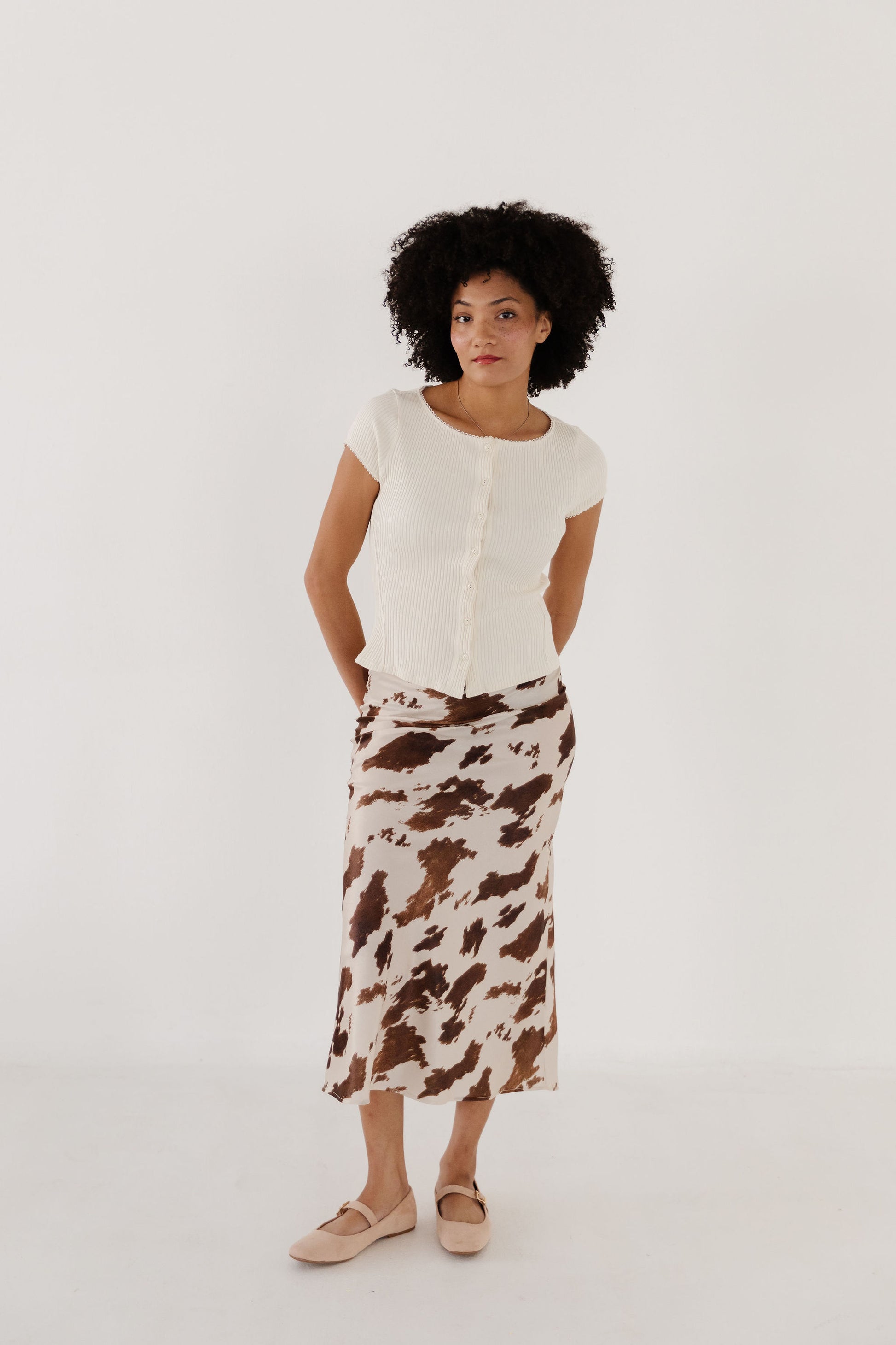 Moo-ve over, basic wardrobe! This midi skirt is here to shake things up with its bold cow print in creamy and rich brown tones. Perfect for anyone ready to make a statement without trying too hard, The Dakota pairs effortlessly with your favorite tee or tucked-in blouse. The midi length hits just right for a polished yet fun vibe that works from brunch to date night. Embrace your inner fashion rebel—this skirt proves that playful prints are always in style.