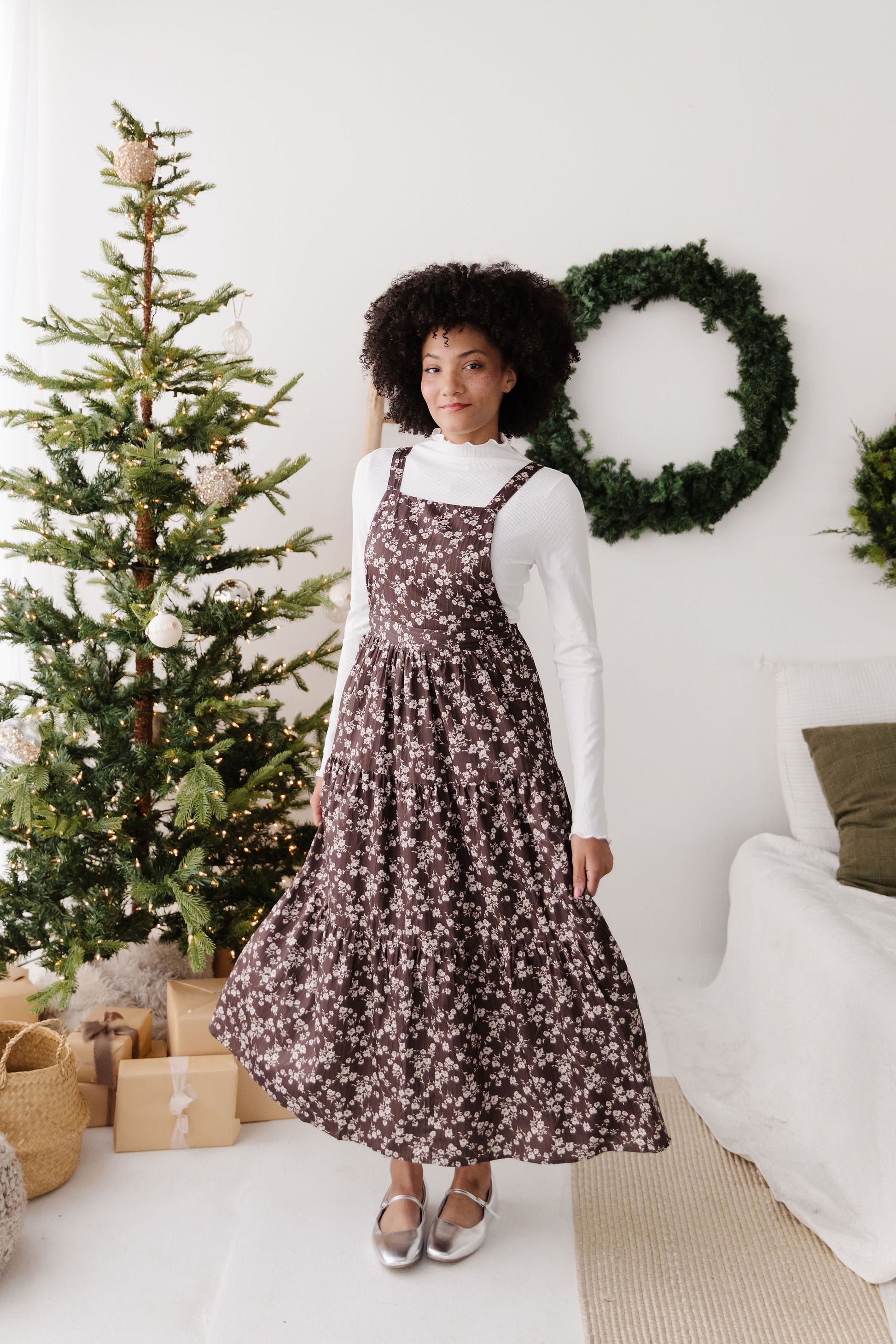 THE DANNY FLORAL OVERALL DRESS IN BROWN