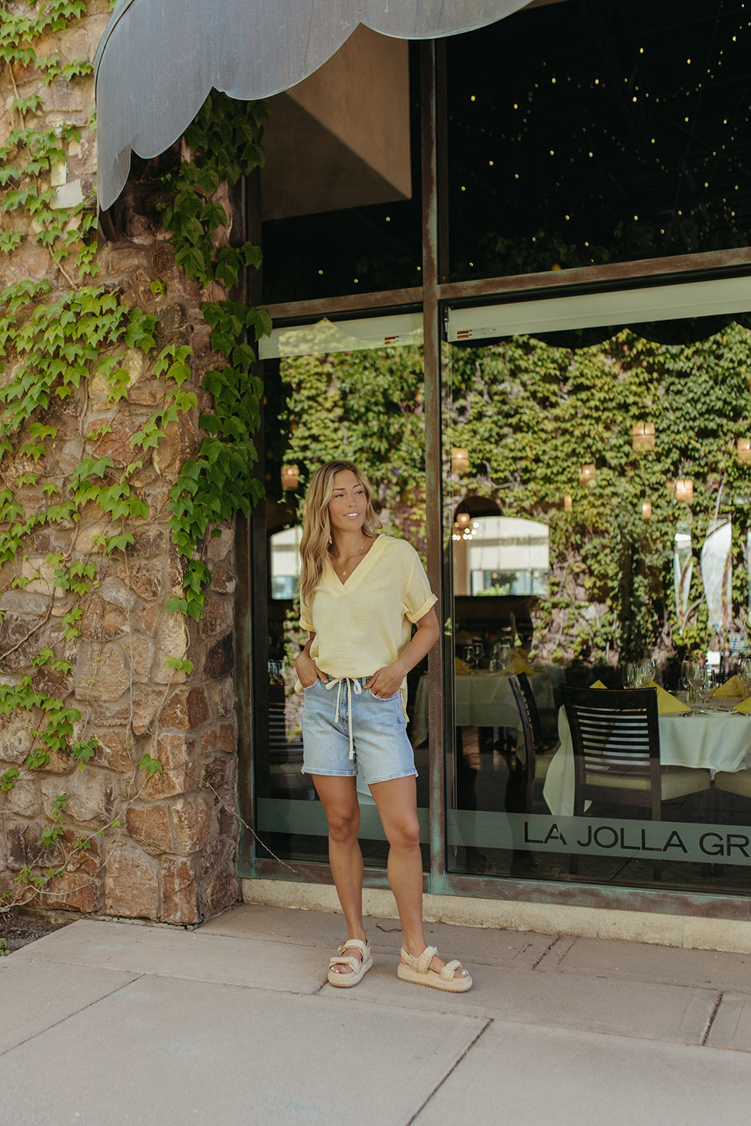 Paired with THE TRUDIE TOP IN LEMON and THE RAFFIA SLINGBACK PLATFORM SANDALS IN TAN.