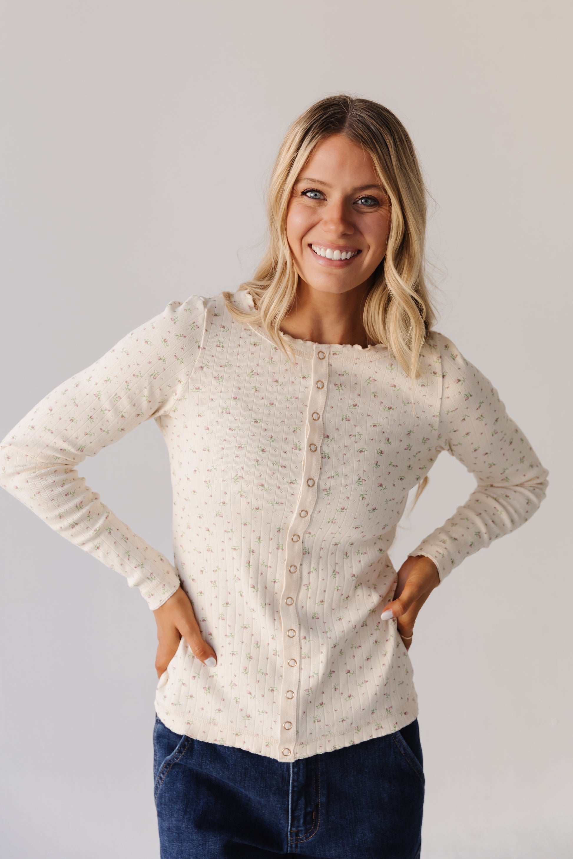 Introducing the Eloise—your new go-to for effortless charm! This ribbed long-sleeve top features a delicate floral design that brings a touch of botanical beauty to your everyday wardrobe. The convenient snap closures make getting dressed a breeze, while the fitted ribbed fabric flatters your silhouette. Soft, versatile, and undeniably cute in buttercream, it's the perfect piece for layering or wearing solo. Dress it up or down—the Eloise does it all!