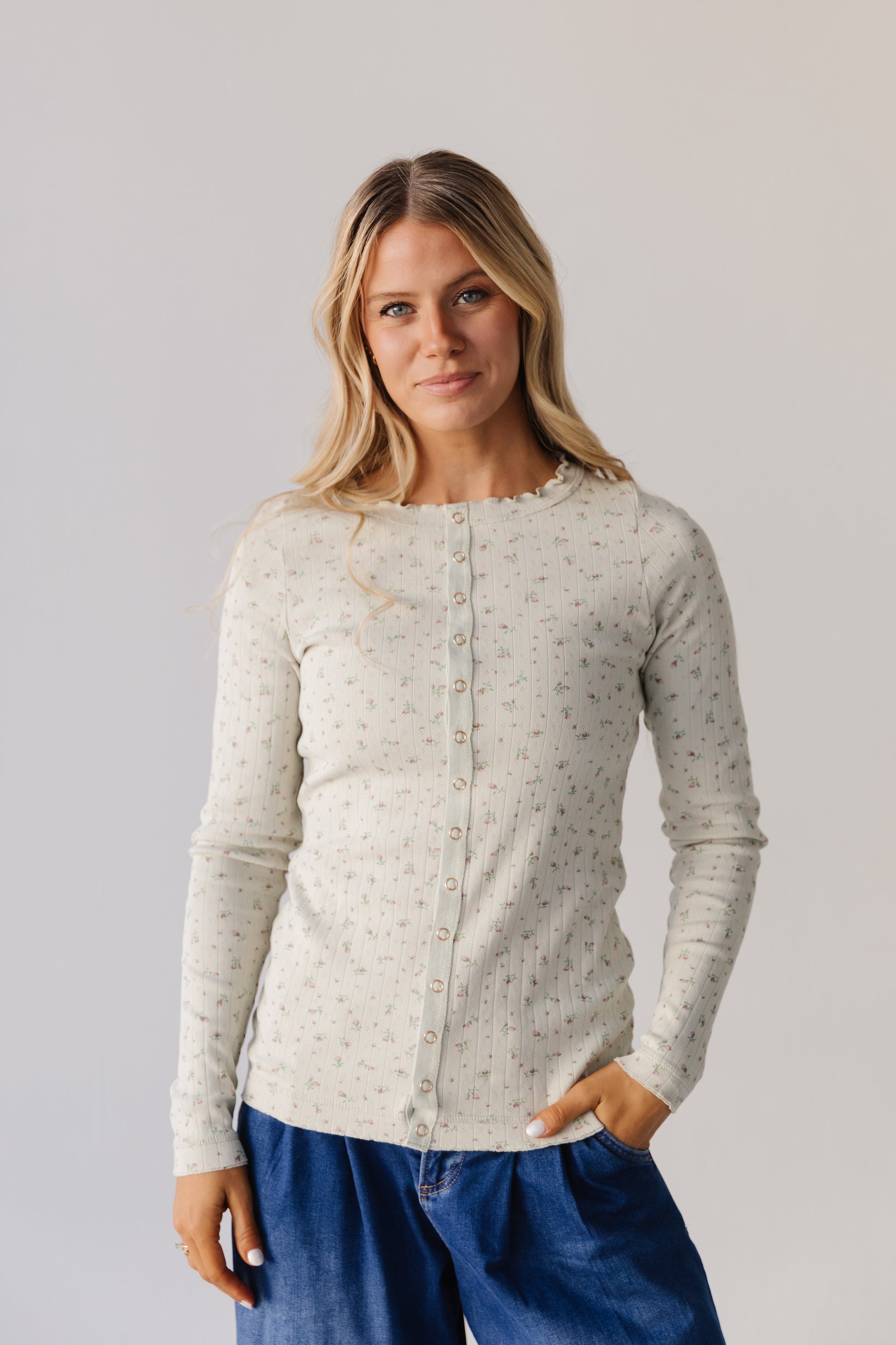 Introducing the Eloise—your new go-to for effortless charm! This ribbed long-sleeve top features a delicate floral design that brings a touch of botanical beauty to your everyday wardrobe. The convenient snap closures make getting dressed a breeze, while the fitted ribbed fabric flatters your silhouette. Soft, versatile, and undeniably cute in moss green, it's the perfect piece for layering or wearing solo. Dress it up or down—the Eloise does it all!