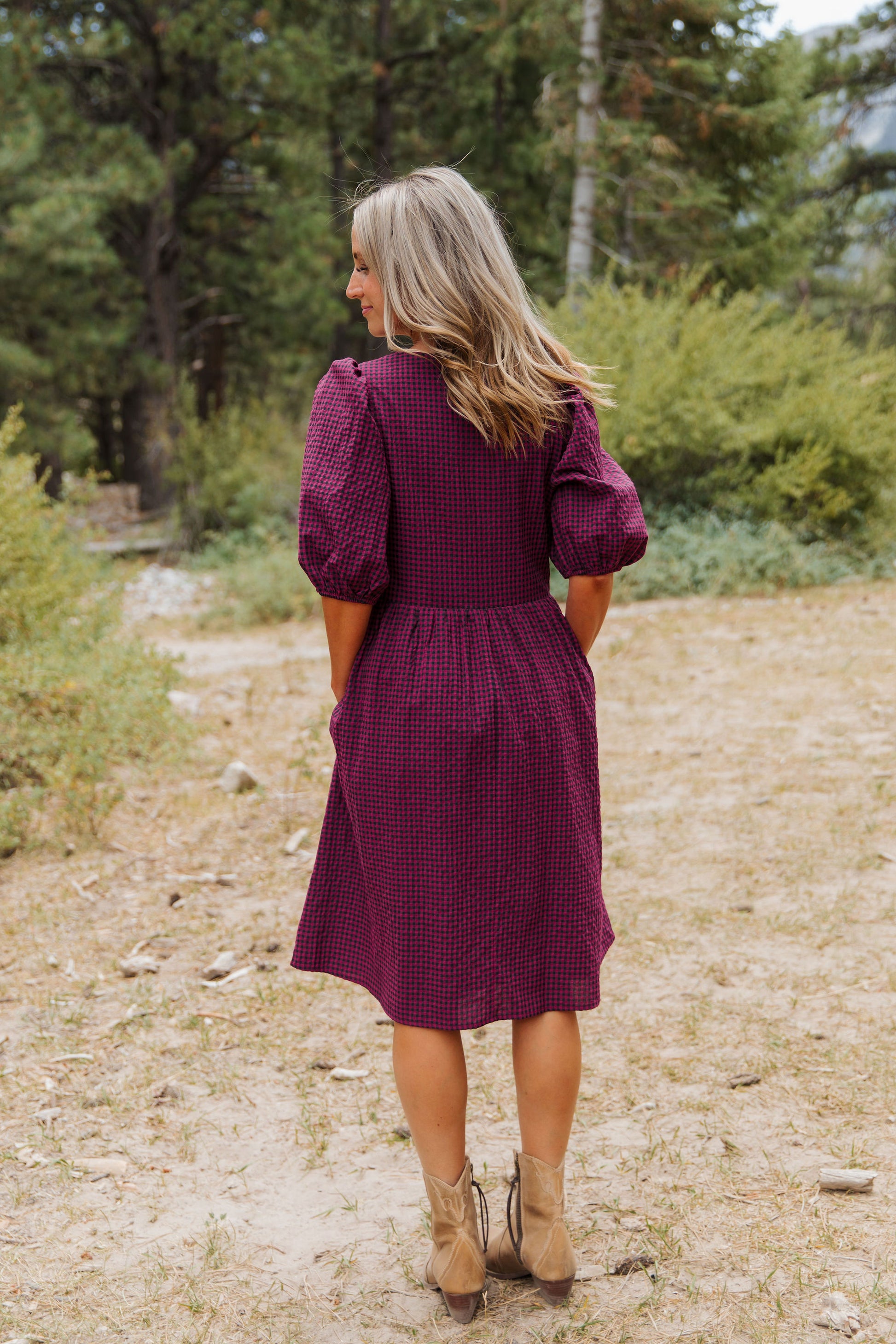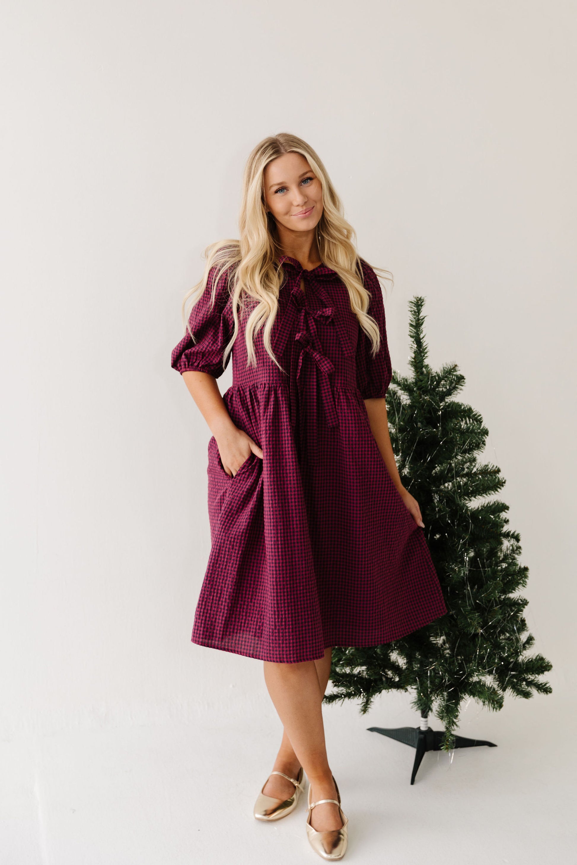 THE HARLOW BOW DRESS IN BURGUNDY CHECKERED BY PINK DESERT