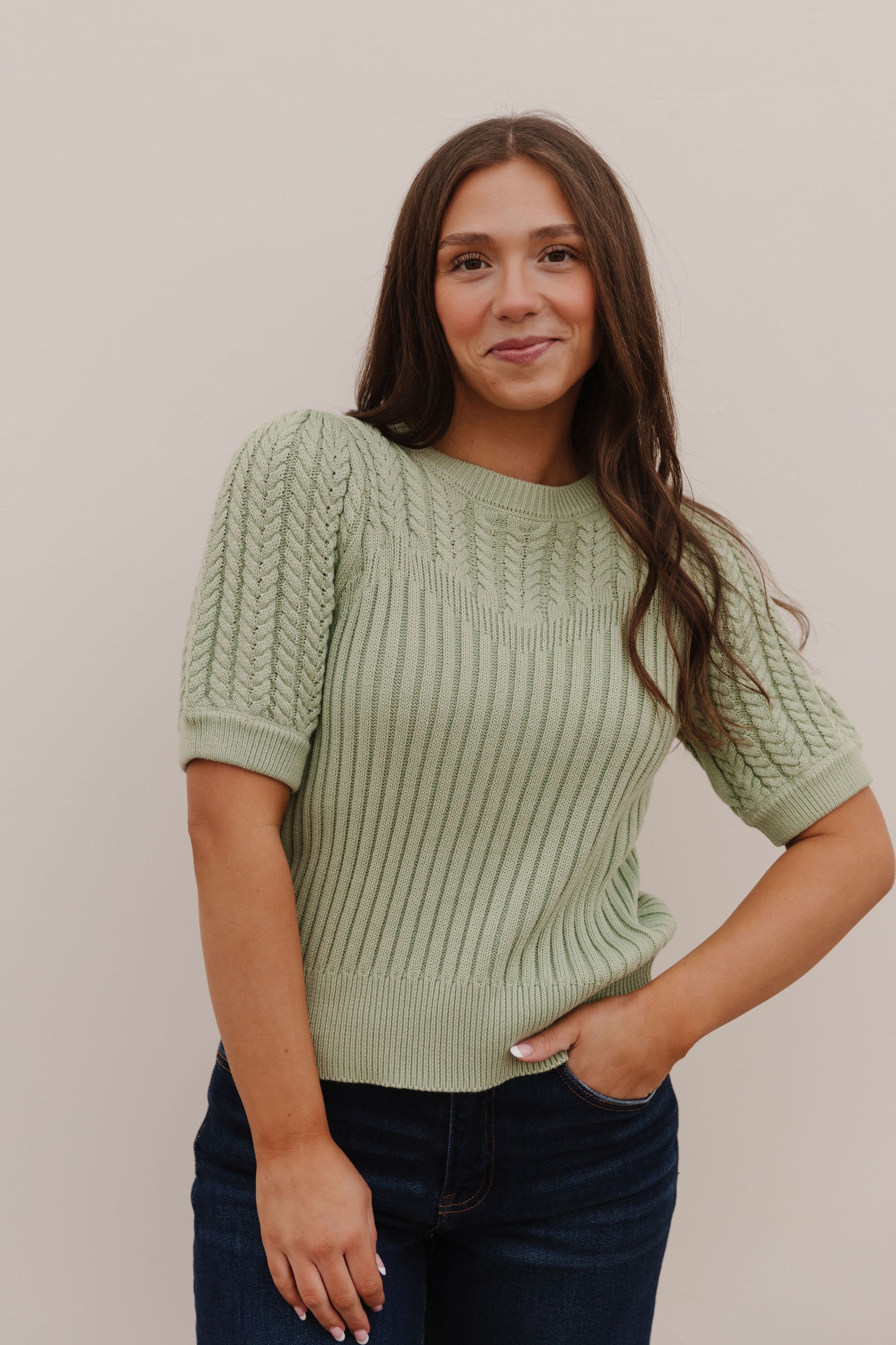 Elevate your layering game with The Kassidy—a sage cable knit sweater that's equal parts cozy and chic. Those adorable puff sleeves add instant personality to any outfit, while the short sleeve cut keeps things breezy and versatile. Perfect for throwing over your favorite tee or pairing with a crisp button-down. This trendy piece is basically your new go-to for effortless style that actually feels as good as it looks.