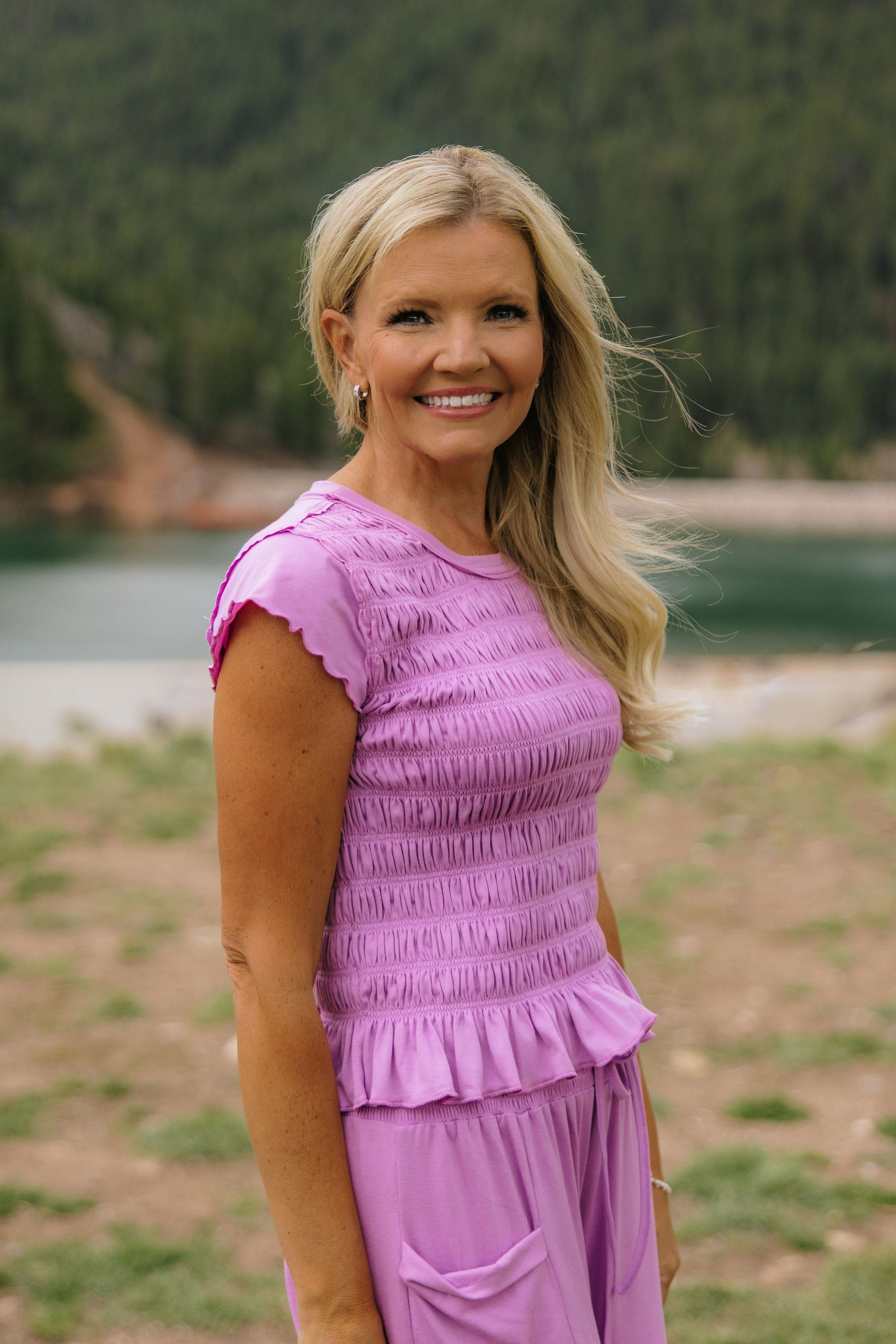 Effortlessly feminine with a relaxed, modern feel—this lavender set is the perfect blend of comfort and style. The smocked top features a soft, stretchy fit with delicate texture and subtle flutter detail at the hem, while the wide-leg pants offer a flowy silhouette with an adjustable drawstring waist and functional pockets. Lightweight and easy to wear, this set is perfect for everything from casual days out to elevated lounging.