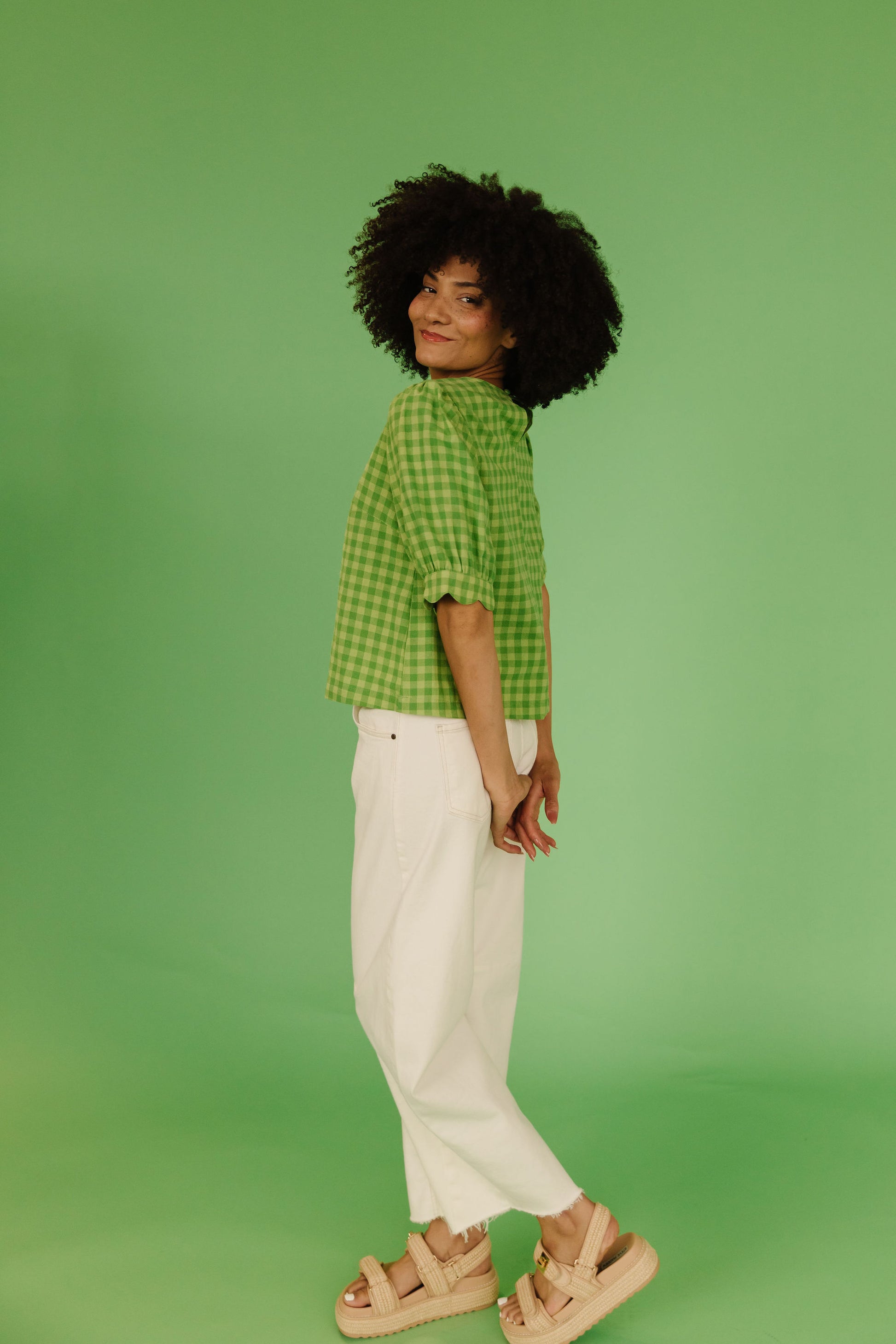THE LOLA PLAID SCALLOP SLEEVE BLOUSE IN MATCHA
