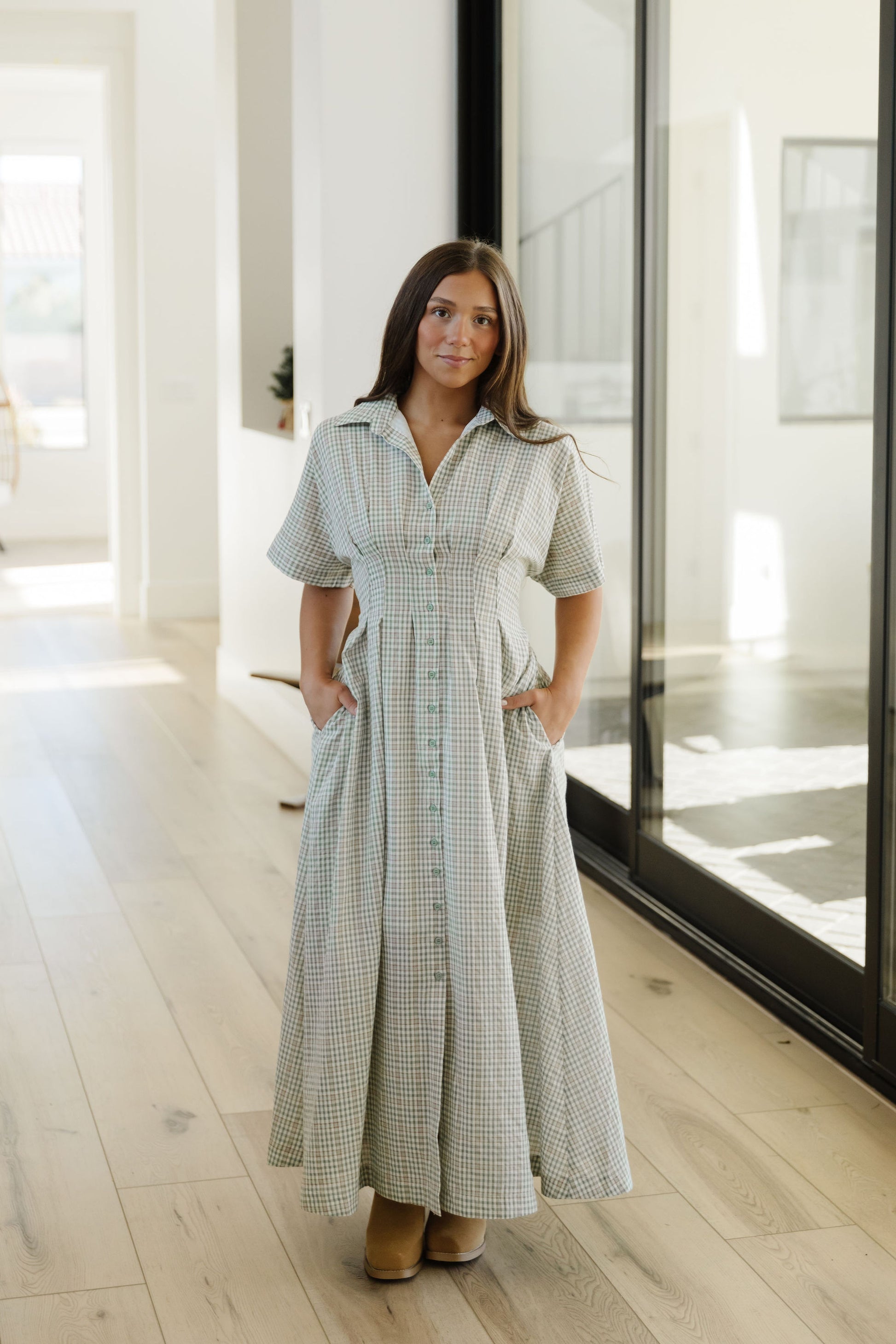 Meet your new wardrobe obsession—The Lynnae plaid button-down dress in a soothing fern shade. This maxi marvel combines laid-back comfort with undeniable charm, featuring a relaxed silhouette that feels like a hug. The classic plaid pattern and full-length cut make it perfect for layering or wearing solo. Button it up for polished vibes, leave it partially unbuttoned for a flowy feel, or tie it at the waist for a playful twist. From brunch to errands, this dress is your cozy companion for every occasion.