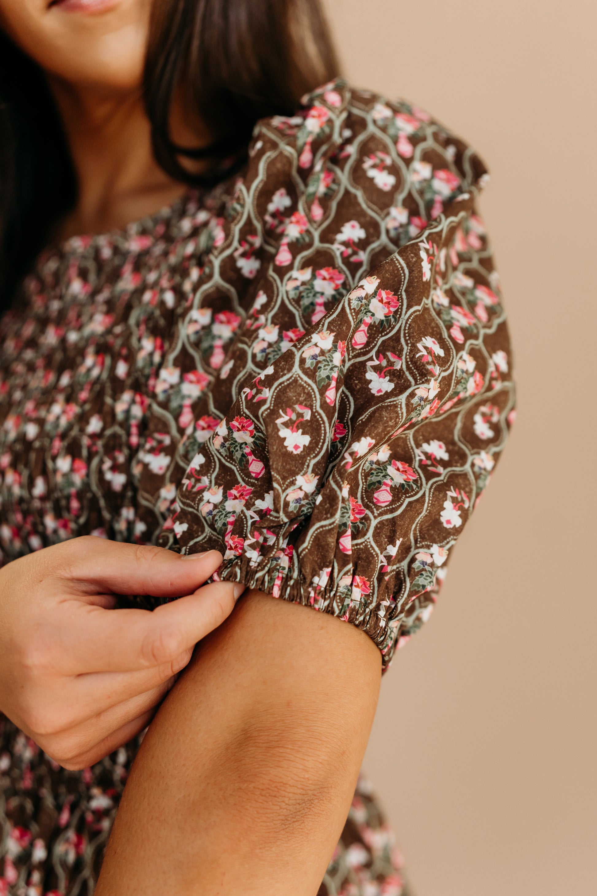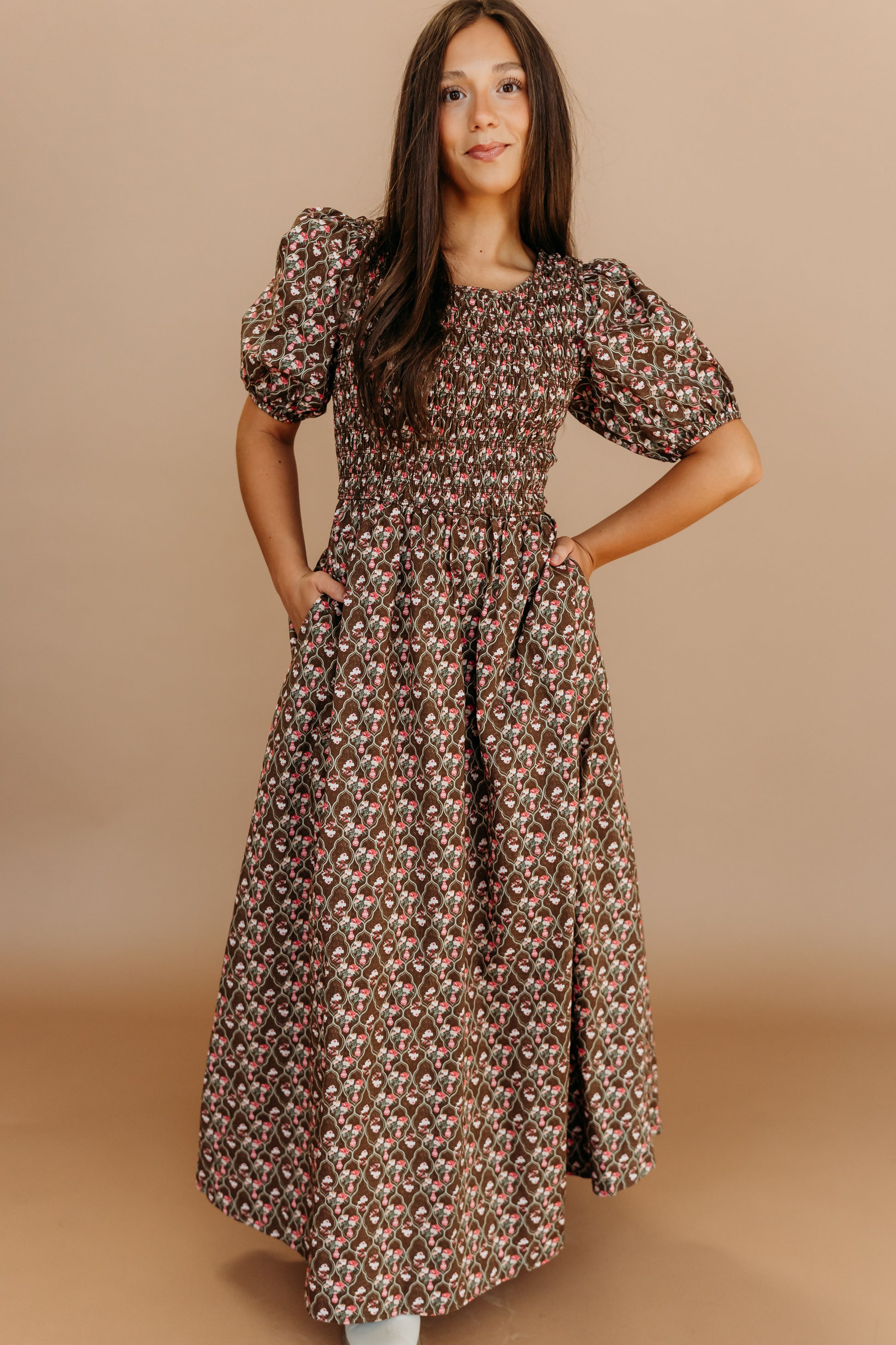 THE MAXINE SMOCKED FLORAL MAXI IN MOCHA