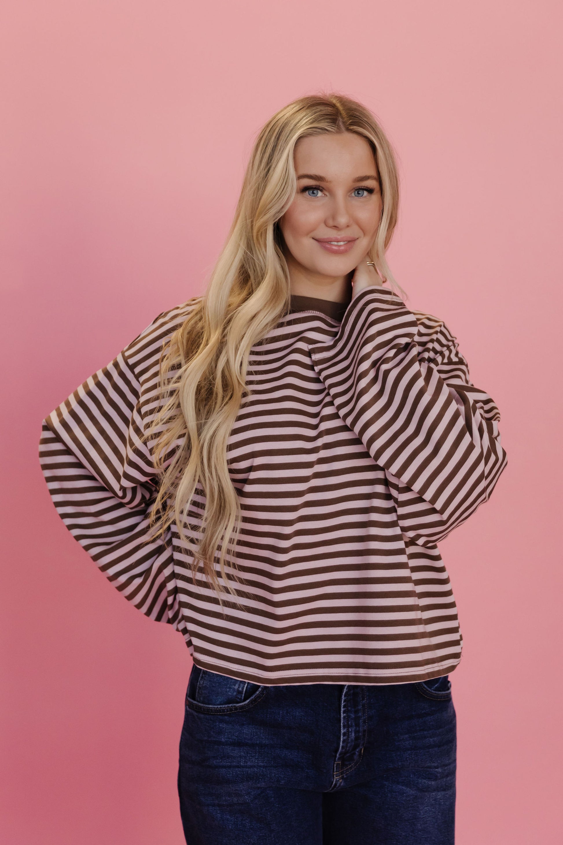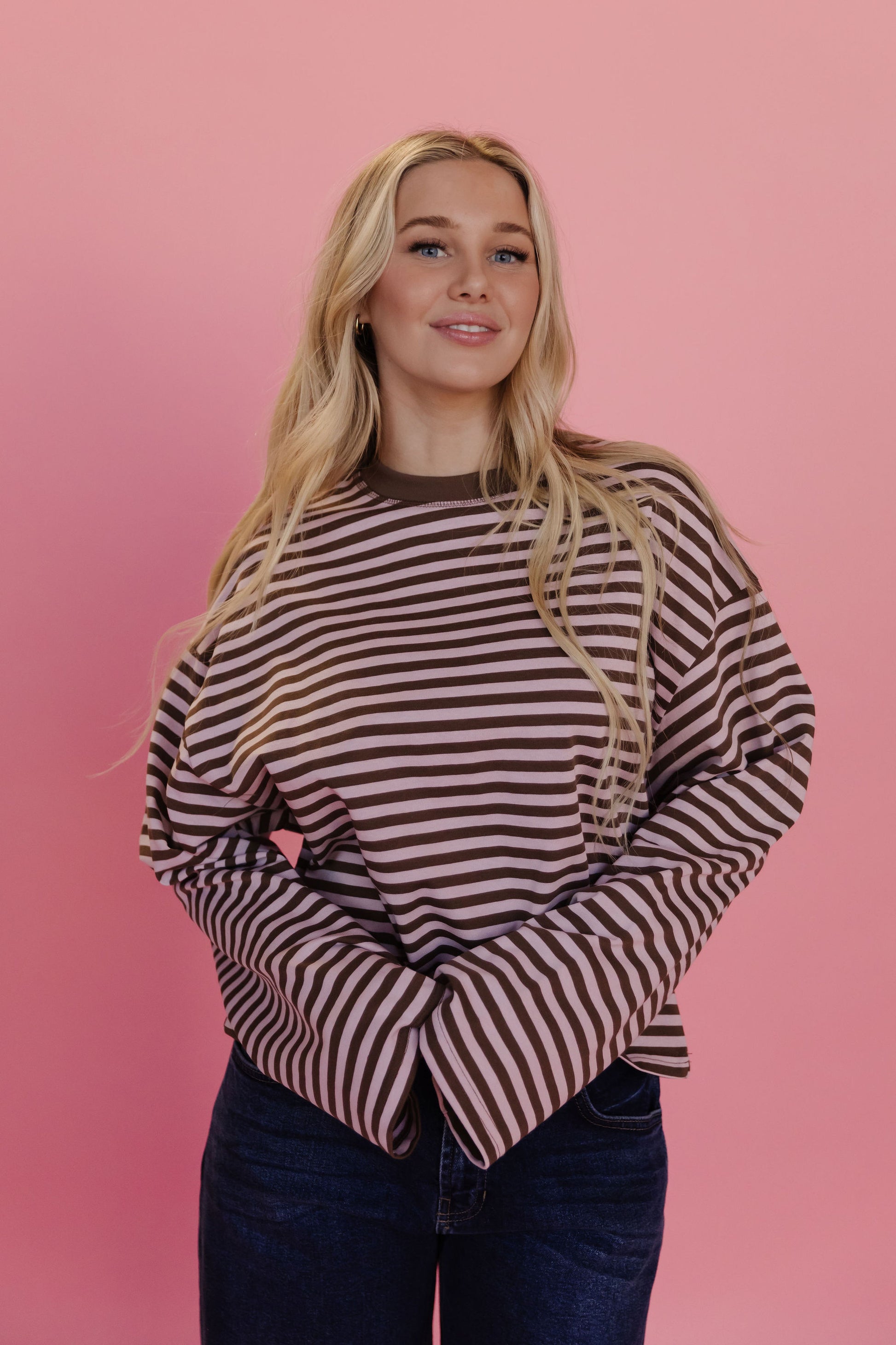 Elevate your casual wardrobe with this adorable striped long-sleeve top in brown and soft pink. The classic stripe pattern brings timeless charm while the relaxed fit keeps things effortlessly cool. Perfect for layering or wearing solo, this trendy piece transitions seamlessly from weekend hangouts to laid-back office vibes. Pair it with your favorite jeans or skirt for an instantly put-together look that feels anything but basic.
