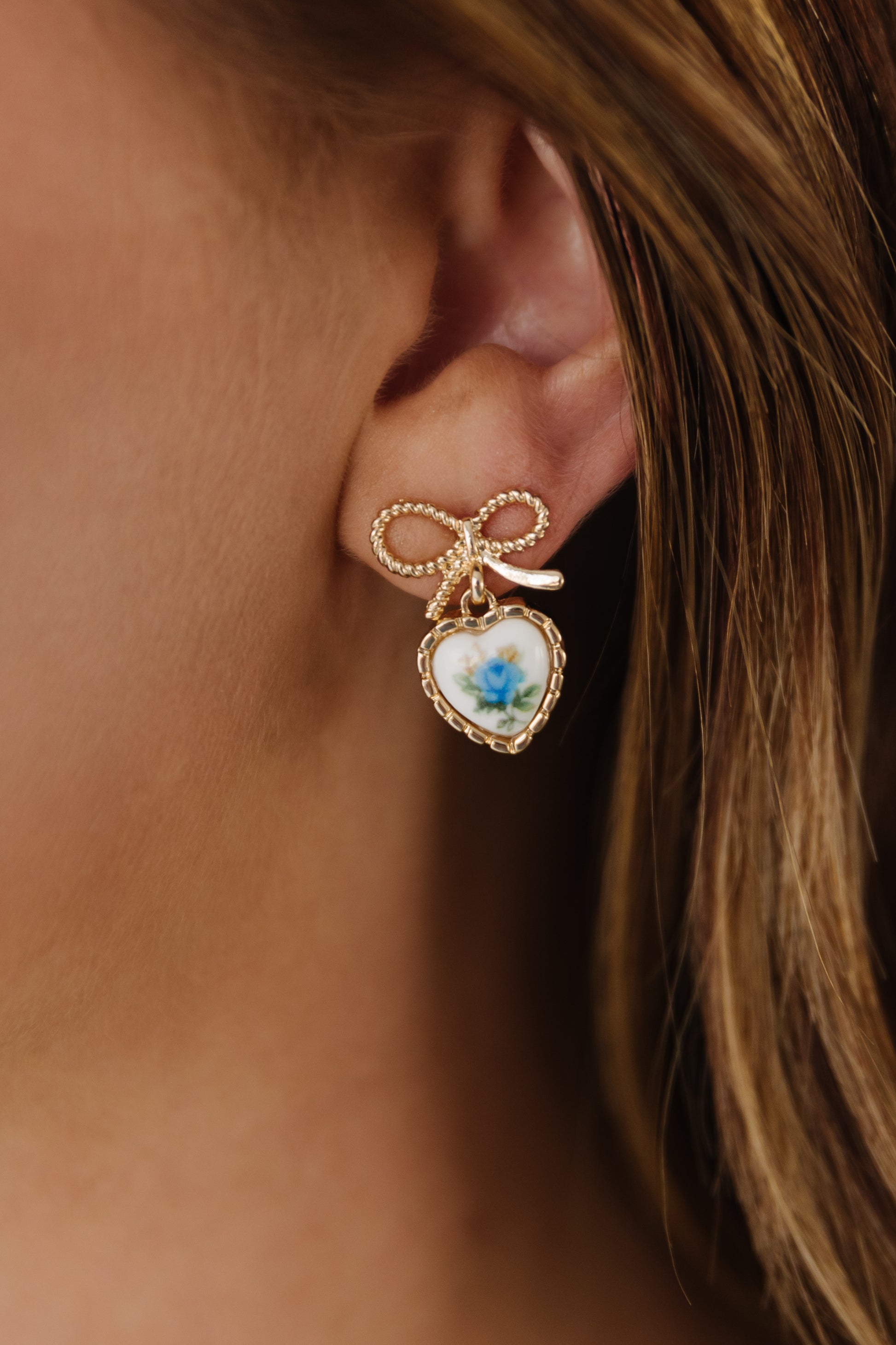 Add a charming vintage twist to your style with these playful Porcelain Heart Earrings. Featuring delicate gold bows and a porcelain-inspired finish, they bring a touch of timeless elegance with a fun, whimsical flair perfect for any occasion.