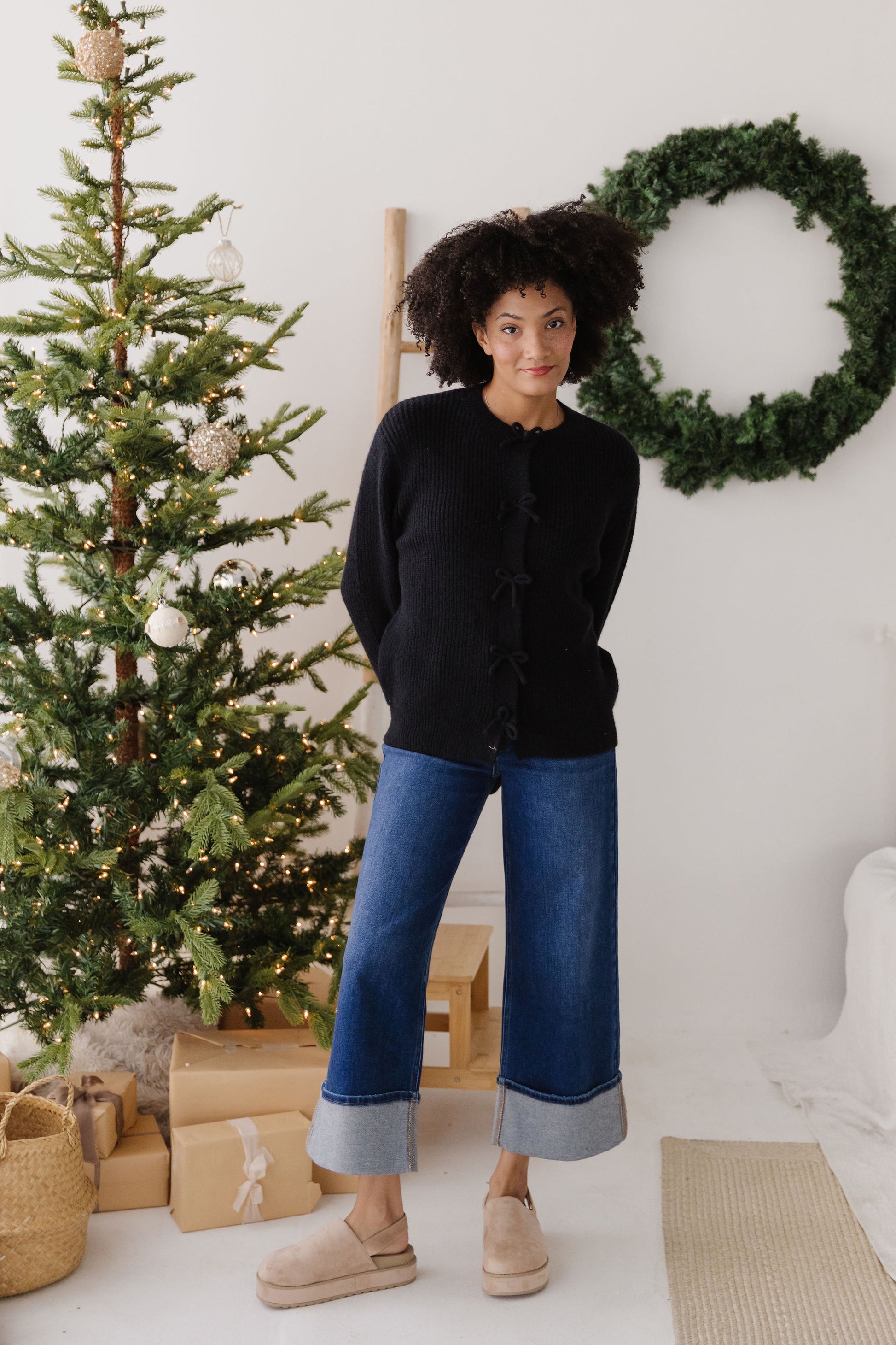 Introducing the Portia Bow Cardigan—your go-to layer that's equal parts sweet and sophisticated. This black long-sleeve beauty snaps up the front for easy on-and-off styling, while a delicate bow accent brings that extra dash of charm. Whether you're layering over a dress, pairing with jeans, or throwing it on solo, this cardigan is your ticket to looking put-together without trying too hard. Playful, practical, and absolutely timeless.