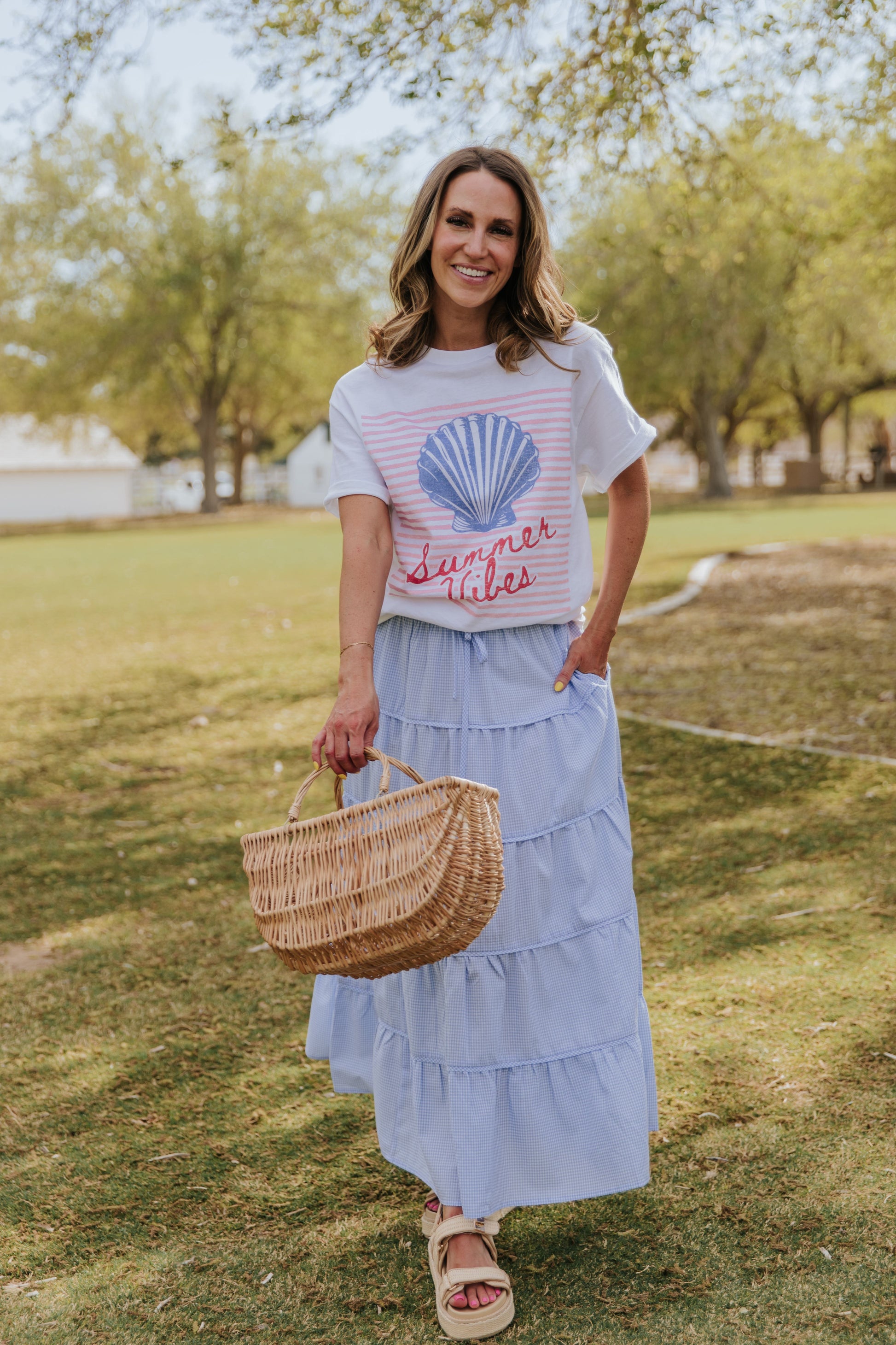 Paired with THE GRACELYN GINGHAM MIDI SKIRT IN SKY