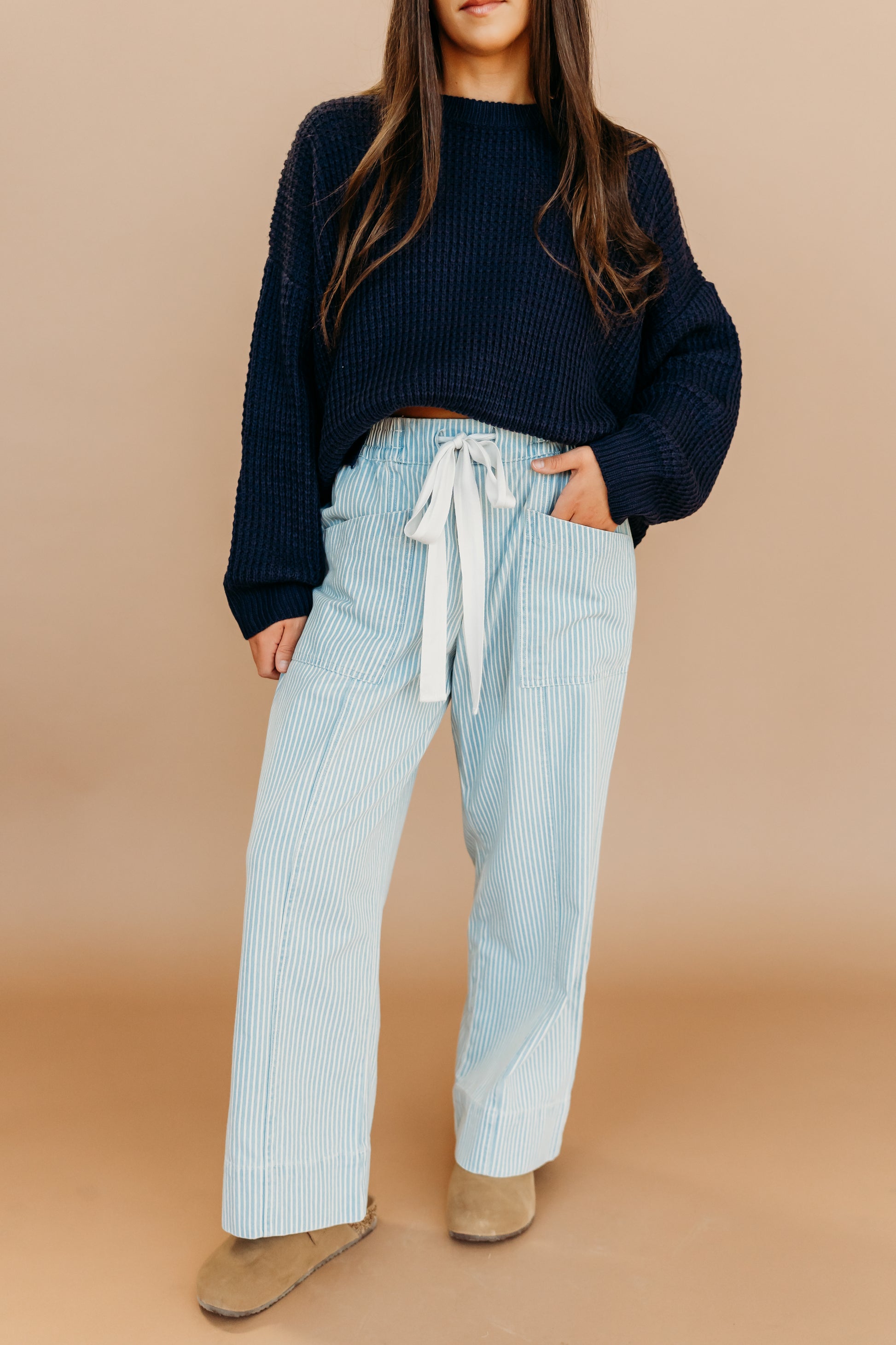 Bring a playful twist to your casual wardrobe with these light blue jeans featuring white stripes. The drawstring waist offers adjustable comfort, while the wide-leg cut keeps your look effortlessly cool and relaxed. Perfect for sunny days and easygoing vibes.